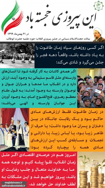 بیانات تولیت محترم مسجد و مدرسه علمیه ابوالائمه حضرت ابوطالب (علیه‌السلام)، جناب حجت‌الاسلام سینایی، در جشن پیروزی انقلاب مورخه 21 بهمن‌ماه 1399