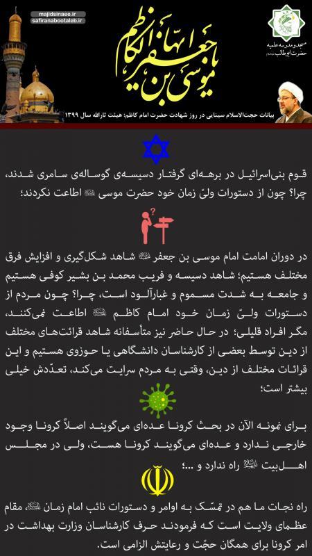 بیانات تولیت محترم مسجد و مدرسه علمیه ابوالائمه حضرت ابوطالب (علیه‌السلام)، جناب حجت‌الاسلام سینایی، در روز شهادت امام کاظم (علیه‌السلام)؛ هیئت ثارالله (علیه‌السلام) مورخ 19 اسفندماه 1399