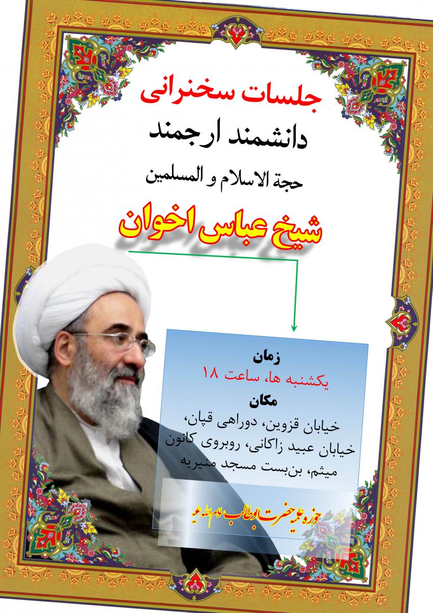 جلسه تفسیر حجت الاسلام شیخ عباس اخوان که به قرار هر هفته روزهای یکشنبه برگزار می شود، این هفته نیز در محل مسجد منیریه و حوزه علمیه حضرت ابوطالب(س) برقرار می باشد.