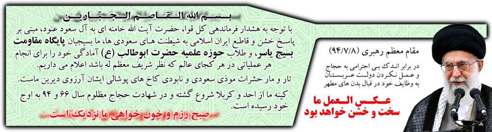 با توجه به هشدار فرماندهی کل قوا، حضرت آیت الله خامنه ای به آل سعود عنود، مبنی بر پاسـخ خشن و قاطـع ایران اسلامی به شیطنت هـای سعودی ها، ما بسیجیان پایگاه مقاومت بسیج یاسر، و طلاب حوزه علمیه حضرت ابوطالب (ع) آمادگی خود را برای انجام هر عملیاتی در هر کجای عالم که نظر شریف معظم له باشد اعلام می داریم.